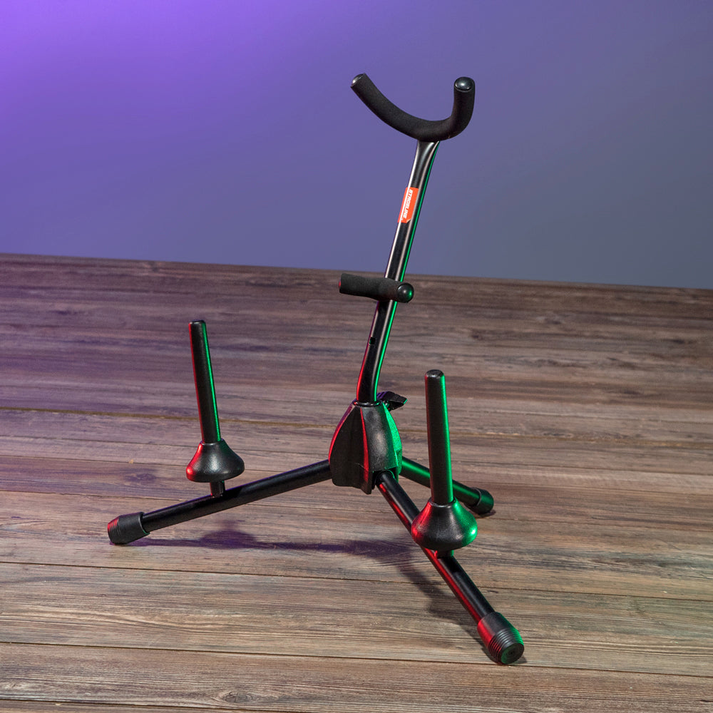 Our SAX32 combination stand can accommodate a single saxophone, along with two clarinets or flutes on the included side pegs. The stand is adjustable to hold either an Alto or Tenor saxophone, with an angled backrest for stability and support. The height is 18″, and the base spread is 10.75″. It comes with a durable black finish.